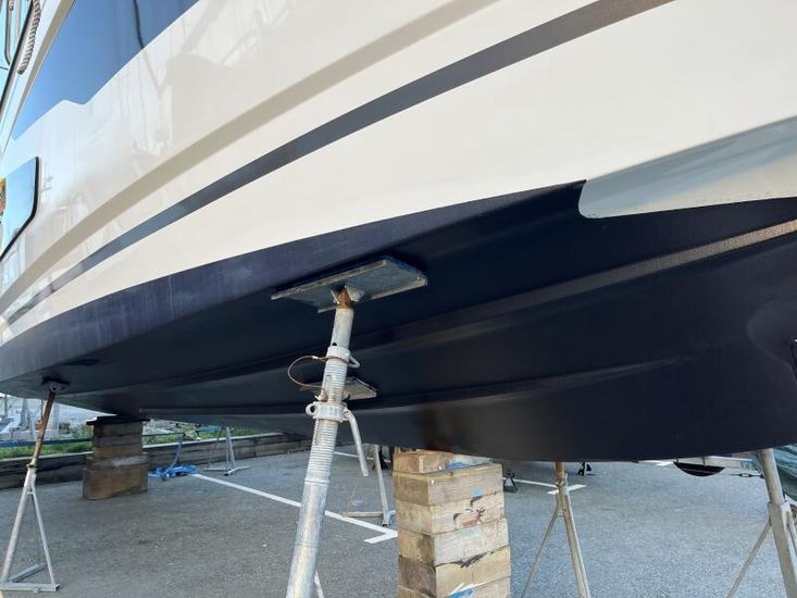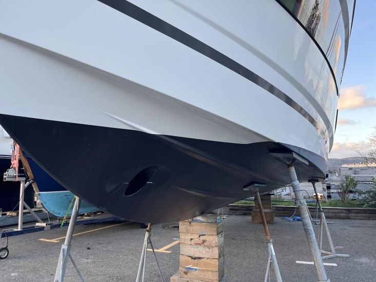 The expansive cockpit showcases a cutting-edge design that allows the aft bench seat to effortlessly slide forward, creating ample space for the engines to be fully elevated when not in use. This area features the customary under-seat storage, complemented by a medium-sized lazarette nestled beneath the cockpit sole, conveniently accessed through a cockpit hatch and with a ladder for easy access. Flanking the sides, extended teak bathing platforms stretch gracefully to both port and starboard. A generously sized transom gate on the starboard side facilitates easy entry to the cockpit, while a portside swinging upright seat enhances comfort. Additionally, a substantial solid opening side gate on the starboard side provides seamless access to the marina pontoon, opening inwards—an advantageous design for berthing against a wall ladder or a high pontoon. Transitioning from the cockpit, you step onto the non-slip foredeck, which boasts two lockers at the bow; one cleverly concealed beneath a spacious sun cushion area and the other situated in the bow itself.