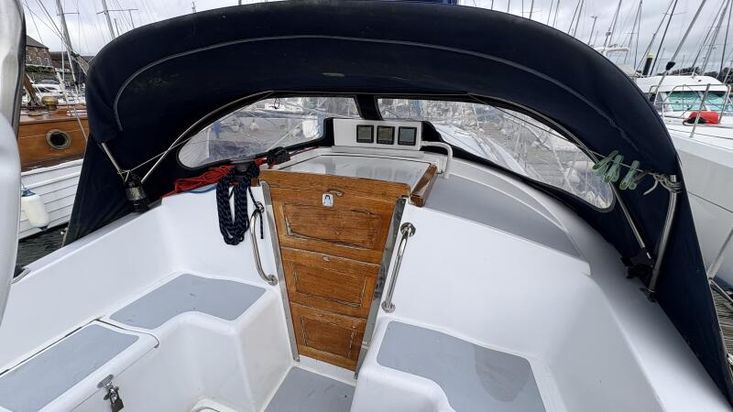 Up through the companionway reveals a spacious cockpit, impressively proportioned considering the yacht's size, offering seating for up to six individuals and ample storage within a deep lockers.