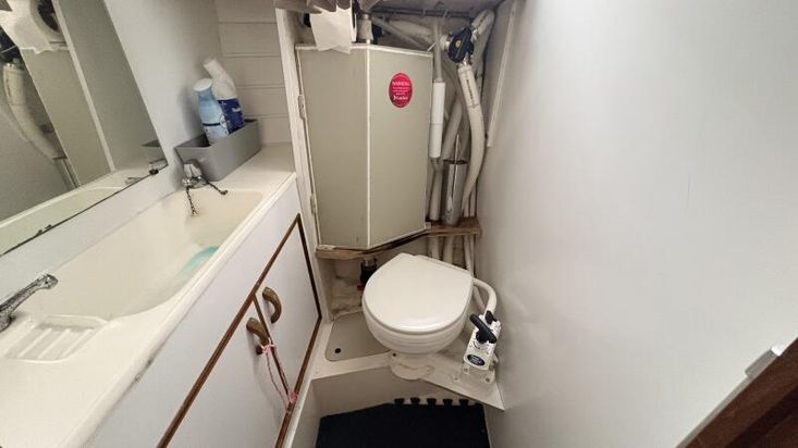 Located aft of the forepeak is the separate Heads compartment, equipped with a Jabsco marine toilet with holding tank along with a single wash basin with shower attachment with hot and cold water with storage underneath.