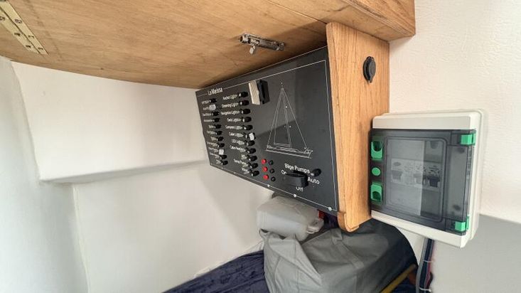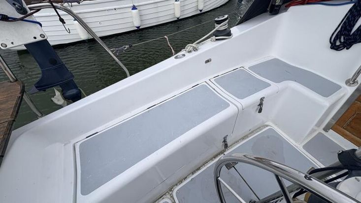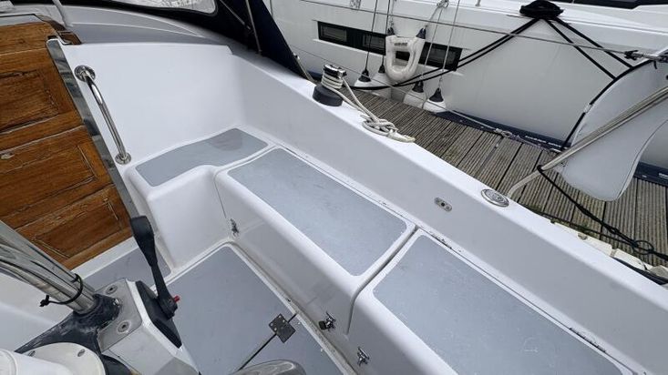The yacht has wheel steering enhancing the sailing experience with its direct control. Instrumentation within the cockpit includes essentials such as a compass and Standard Horizon MFD ensuring navigation and monitoring capabilities are at hand. With engine controls positioned at the rear of the cockpit provide easy access for propulsion management.