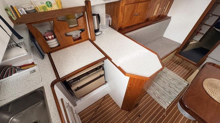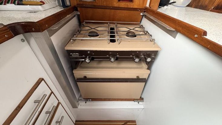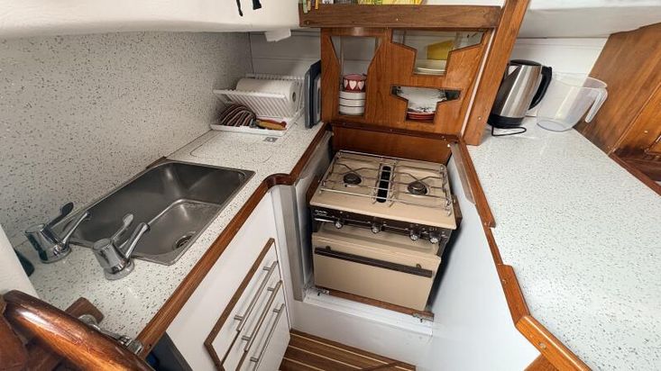 Aft on the port side is the galley with a Flavell Vanessa 2-burner gas stove complete with a grill and oven, sink with pressurized hot and cold water, a 240v/12v fridge box, and ample storage space. Hot water is supplied by a 240v immersion water heater.