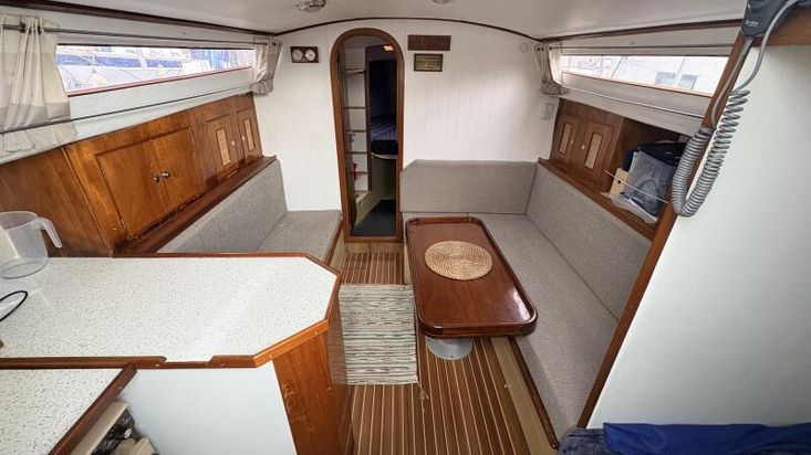 The Moody 30 offers six berths across two cabins. It boasts a generous headroom of approximately 6 feet, ensuring a spacious feel throughout.