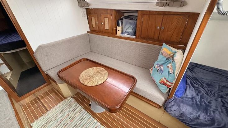 The saloon has an off-centre table to port with two folding leaves, with a U-shaped settee. The saloon table lowers to make into a double berth. On the starboard side, additional settee seating offers a single berth with convenient under-seat and shelf storage.