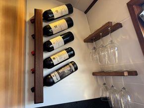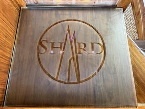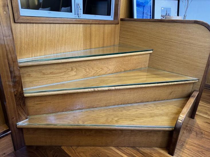 Internally, the floor is constructed of 15mm marine ply overlayed with Natura 22mm iron bark Mississippi engineered Eucalyptus multiply throughout with specific finishes in each part of the vessel. The side linings up to deck level are white painted marine ply with Eucalyptus boxing for the services on both sides. From deck level up to and including the outer head linings, white painted tongue and groove panelling has been used, with the central section of head lining in decorative veneered panelling. Double glazed doors inset with smoked glass provide access to the bow and stern areas with a sliding acrylic hatch above the stern steps. The bespoke staircases at either end of Shard are hand-crafted in oak, walnut and safety glass.