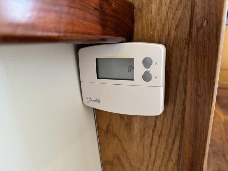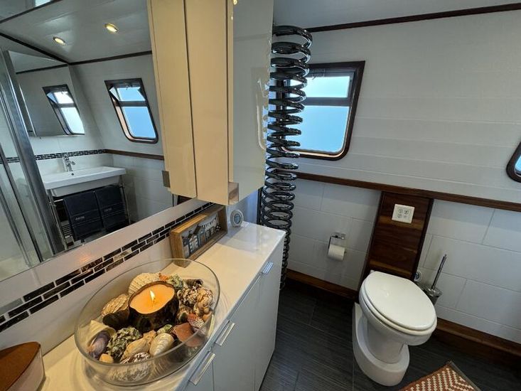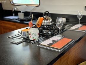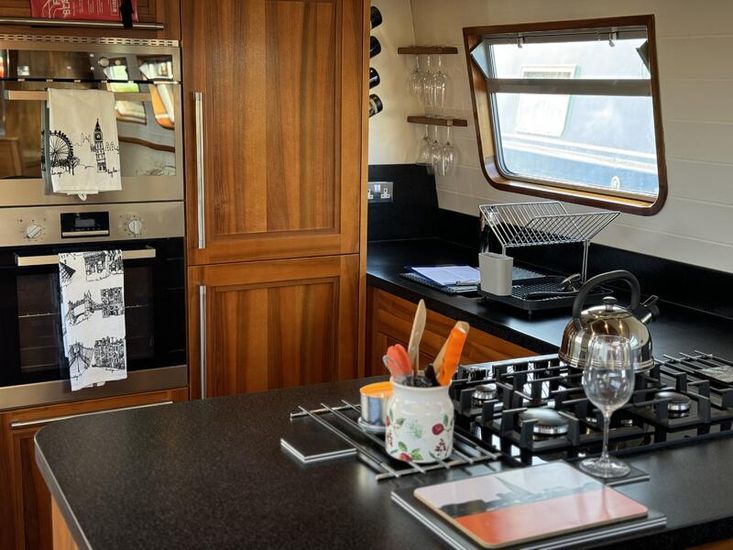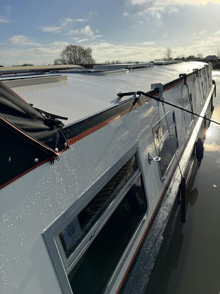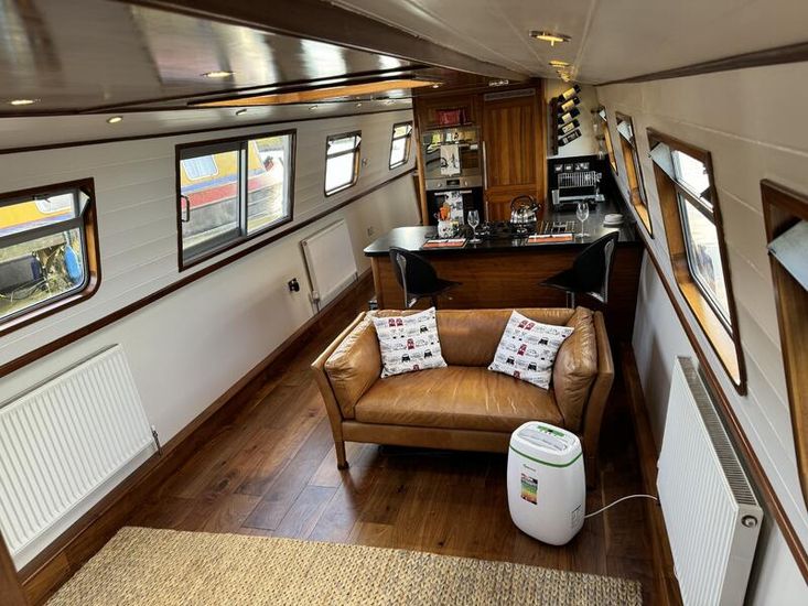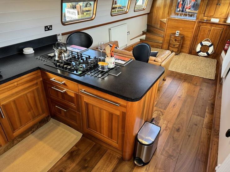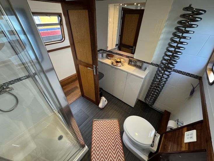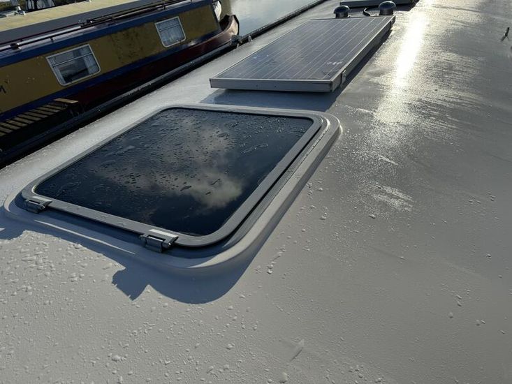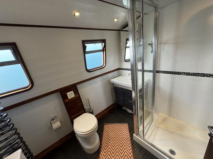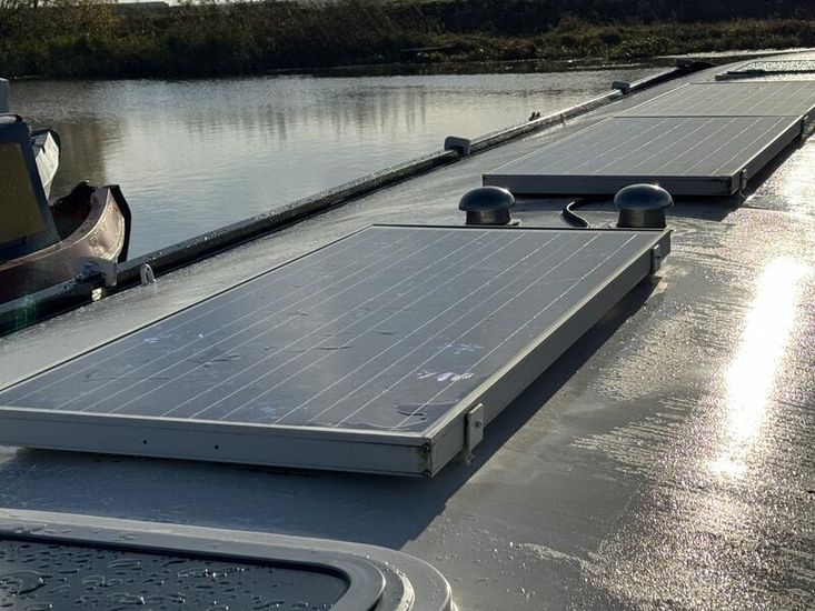 12v – Victron AGM batteries (4 x domestic and 2 x engine cranking), battery condition and charging monitor, twin alternators, Victron Energy MultiPlus inverter/charger, LED cabin lighting (individually switched and dimmable), 3 x solar panels (designed and manufactured specifically for the British weather!) and controller, galley and bathroom extractor fans, electric macerator toilet, navigation lights.