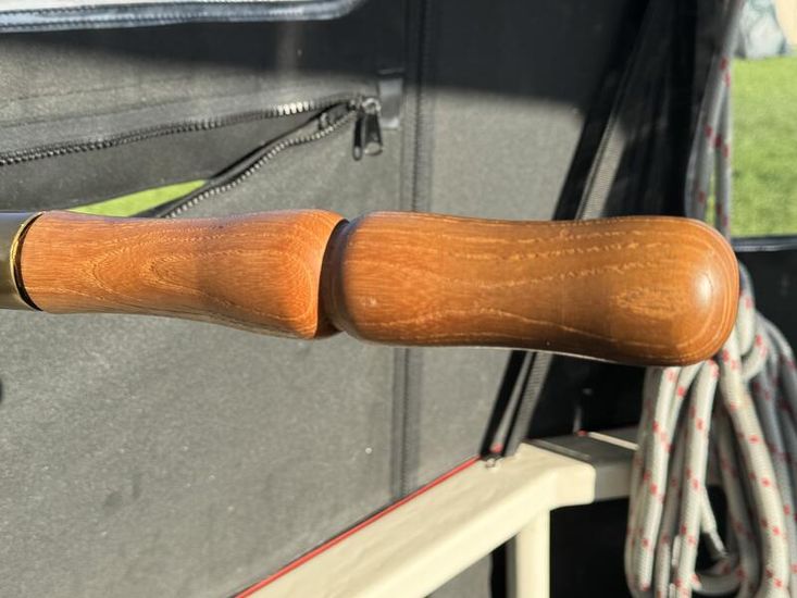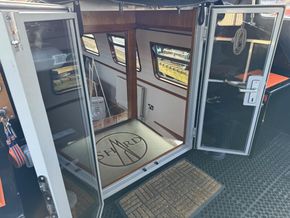 Forward cratch and aft pram hoods in black acrylic fabric designed and fitted by Titan Canopies provide additional covered living spaces and weather protection. All the windows, doors, side and deckhead hatches are bespoke designs with double-glazed smoked glass and aluminium powder coated frames, all manufactured by Seaglaze Marine, specialists in marine glazing for many of the luxury yacht brands. Every window, door and hatch has a hand turned solid American Walnut frame on the inside.