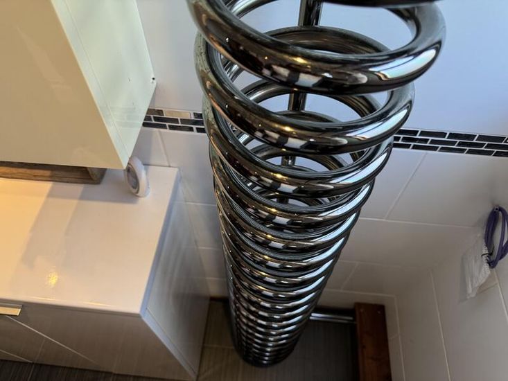 Bathroom 7’5″ x 6’5″ (2.26 x 1.96m) – bulkheads fully tiled in white with chrome and stone mid-height 3cm borders, coordinated brown tiled floor to match the theme of walnut and oak, a 800mm x 1000mm glass encased Hansgrohe shower with adjustable shower head, ceiling light with built in extractor fan, aqua board cladding, fully automatic toilet connected to a waste tank located beneath the double wardrobes in the main cabin, large rectangular porcelain sink with a Hansgrohe mixer tap sitting on a decorative stainless stand with a chromed steel mirror cabinet above, glass storage cupboards, large vanity mirror, dressing table area, and a distinctive designer Bisque black-chromed coiled spring radiator.