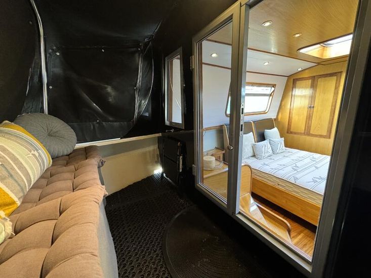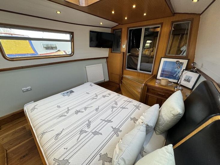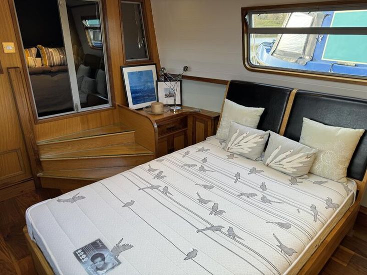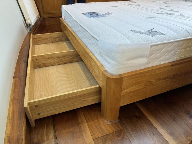 Main Cabin 10’6″ x 9’6″ (narrowing to 7’7″ at the bow) (3.20m x 2.90m narrowing to 2.31m) – a concealed sliding oak and walnut door leads into the bedroom with a solid oak double bed with leather inset headboard, drawer storage beneath and a brand new mattress, two oak and walnut double wardrobes built in to the aft bulkhead with the toilet waste tank neatly concealed beneath, a curved bedside cabinet that abuts the curved steps to the bow area. Double doors, a pair of bulkhead windows, two side windows and a 1m x 1m deck head hatch that opens from 1cm to the full 1m allow plenty of natural light in. LED lighting, panel radiator, walnut flooring. The stainless steel water tank is located behind the staircase and there is a second access panel in the forward bulkhead.