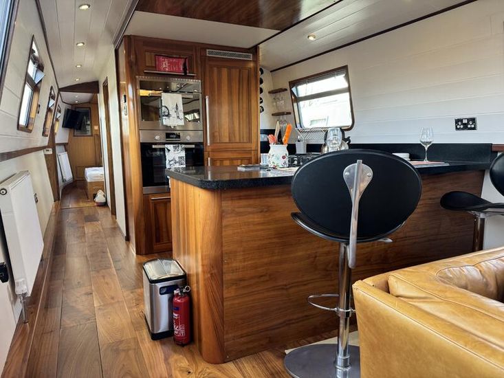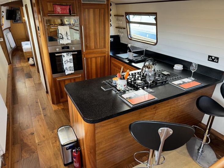 Galley 8’5″ x 9 6″ (2.57m x 2.90m) – solid walnut joinery with storage and appliance cupboards and drawers, a large Corian breakfast bar and work top, a stainless steel SMEG sink with a single mixer tap with a shower head attachment, under-sink water purifying system, integrated appliances, double oven and microwave, integrated LPG hob, discreetly positioned bespoke wine and glass racks, extractor fan and adjustable LED lights, panel radiator.