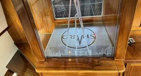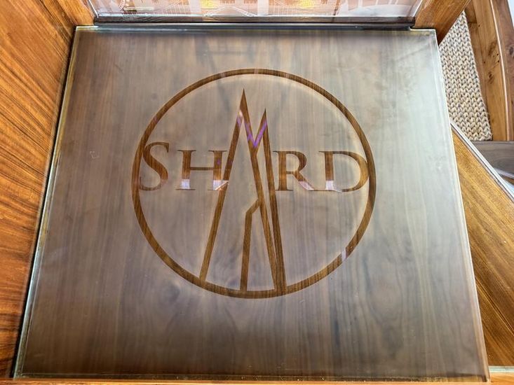 A beautiful, hand-made five step staircase with glass covered treads, a safety glass bulkhead panel embossed with a City of London scene and Shard emblem, leads down to the open plan saloon and galley.