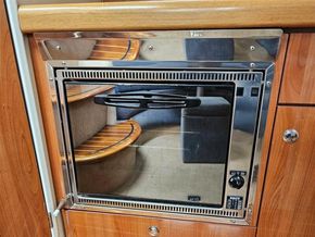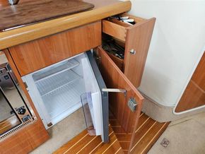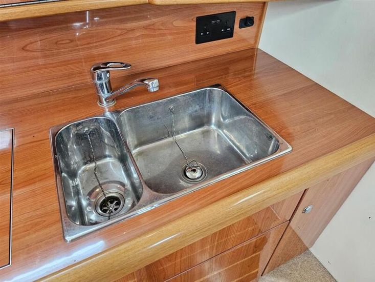 She sleeps six in two double cabins plus a convertible saloon, with a practical jack-and-jill heads featuring a shower. The interior is finished in high-gloss wood cabinetry, creating a bright and comfortable living space.