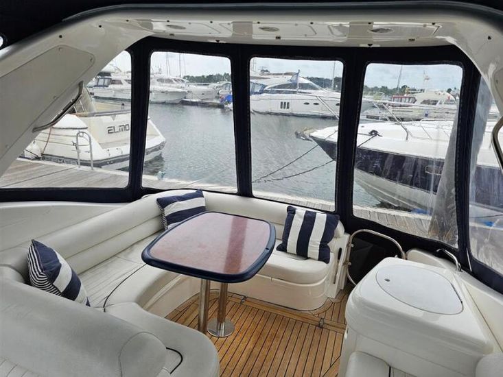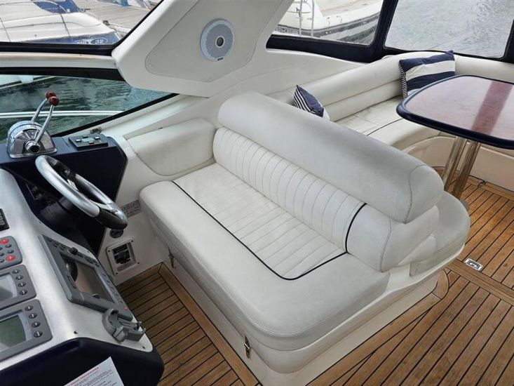 The spacious cockpit offers C-shaped seating, a cockpit table converting to a sun pad, double helm seat, passenger chaise lounge, cockpit fridge, and wet bar—ideal for entertaining.